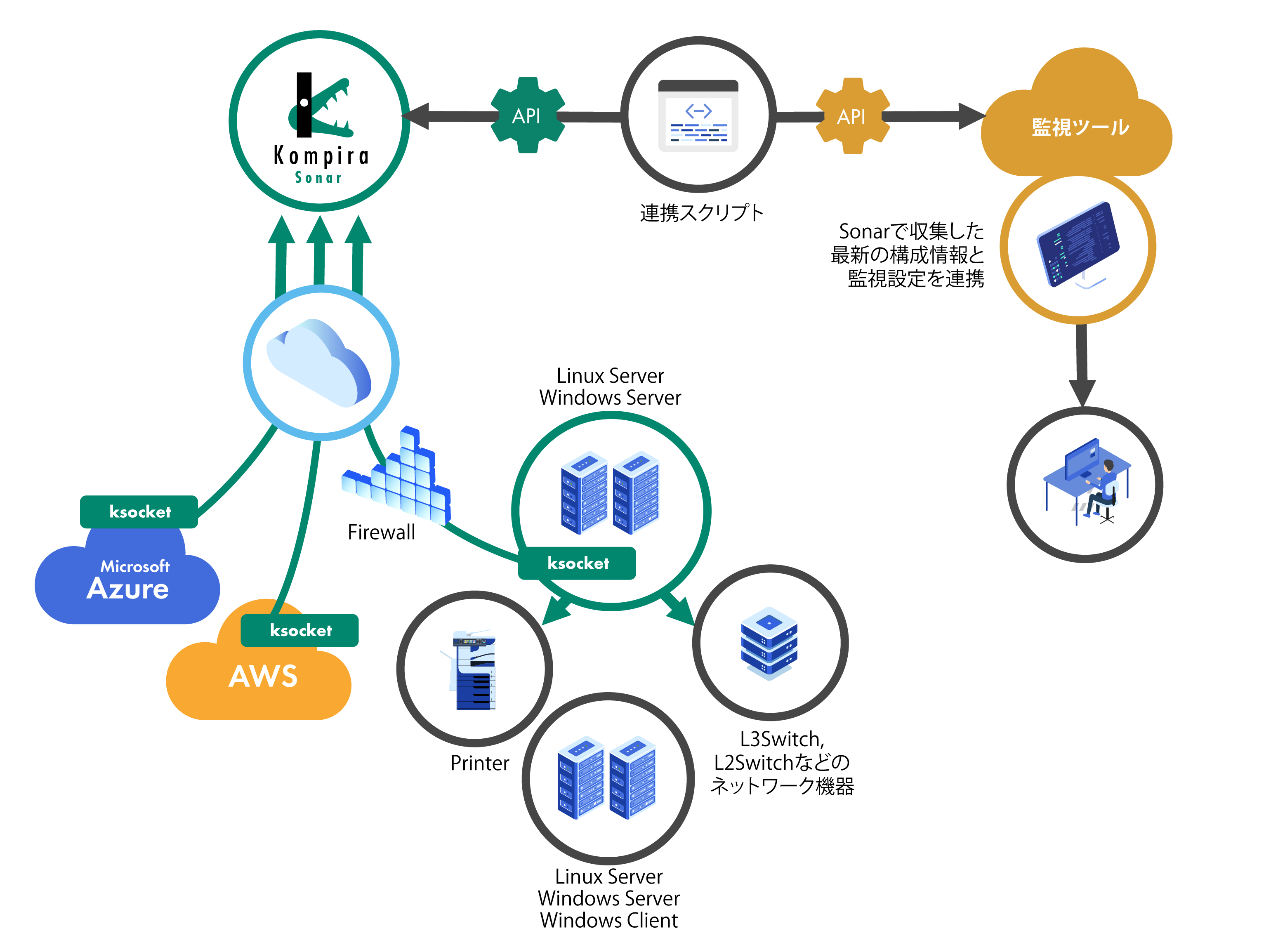 Zabbixなどの監視ツールとKompira Sonarを連携することで、構成管理と監視設定を紐づけることができます。