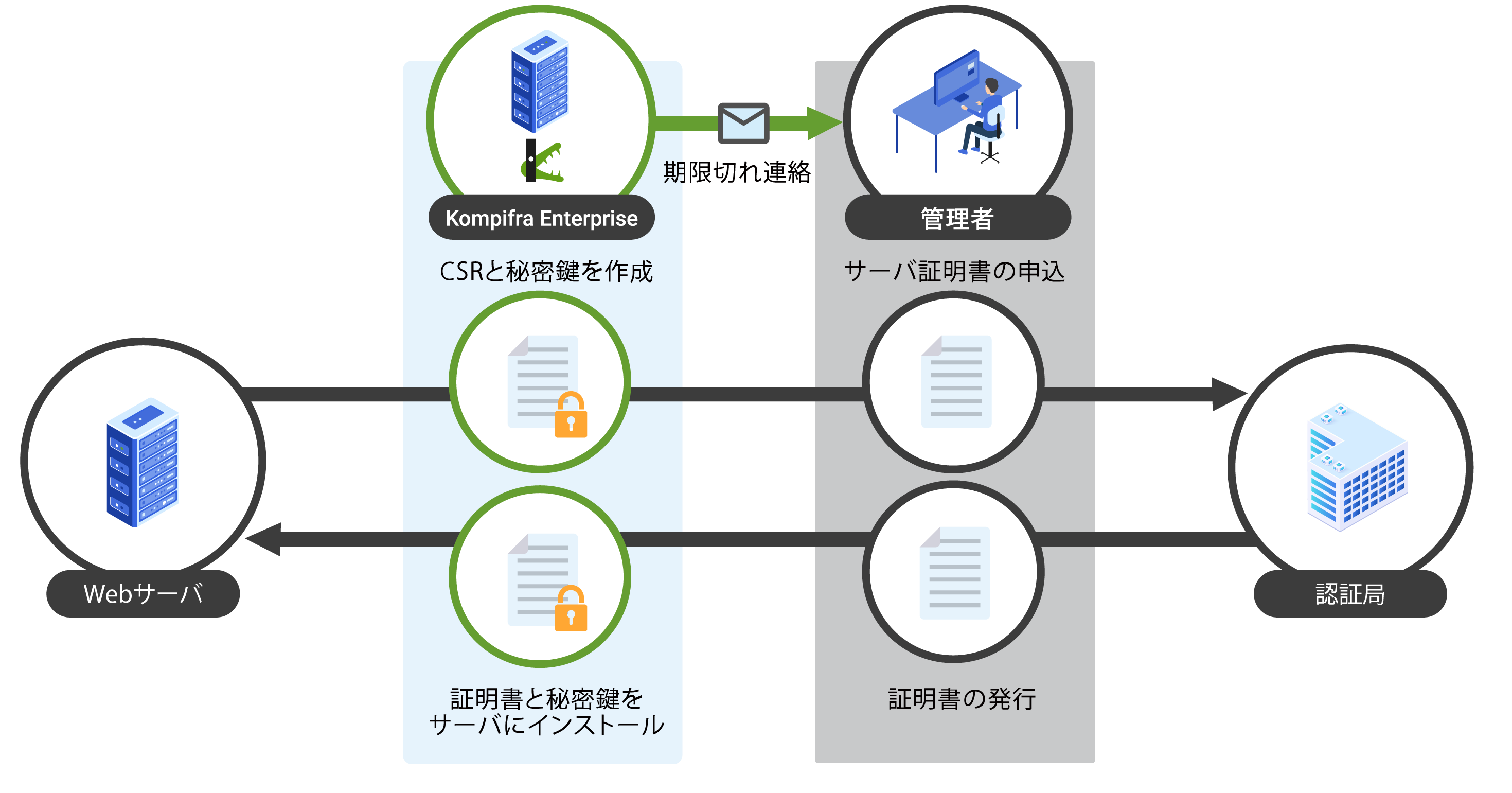 SSL証明書はいつの間にか期限が切れているなど、管理が煩雑になりがちです。Kompira Enterpriseでは、有効期限管理、秘密鍵やCSR作成、証明書の更新の一連の作業を自動化します。